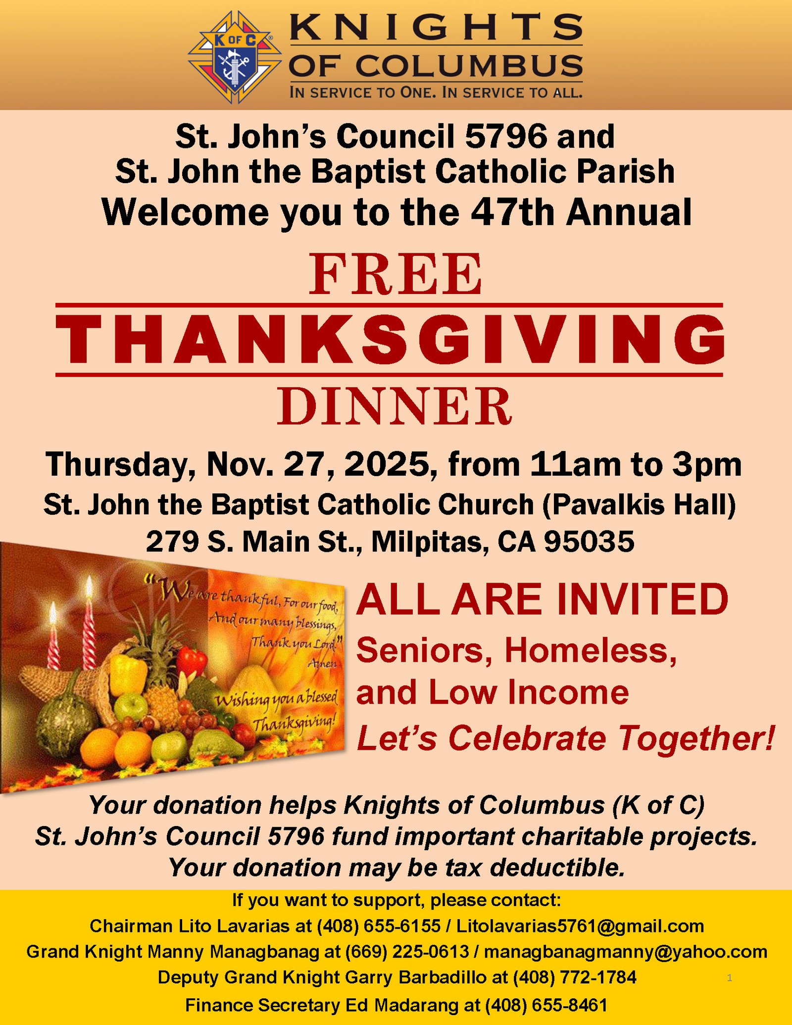 Knights of Columbus 5796 Free Thanksgiving Dinner, Thursday, Nov. 27, 2025 from 11:00 AM to 3:00 PM at St. John The Baptist Catholic Church (Pavalkis Hall) 279 S. Main St. , Milpitas, CA 95035
